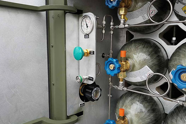 On‑board O₂ storage cylinders; output regulators; LP breaching reels; tool storage; generator.