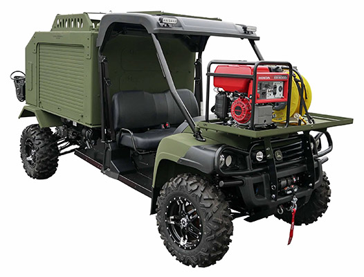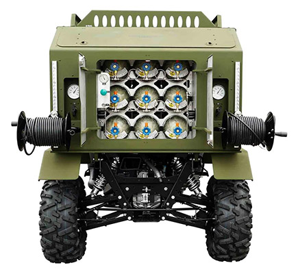 A transportable platform for sustained exothermic breaching and on‑site O₂ refills, built on a modified John Deere 825 Diesel XUV (854 cc). Open‑cab design; reinforced enclosure and roof; high‑output lighting; winch; ~680 kg towing capacity. Dual panels at rear provide access to a 9‑cylinder HP O₂ bank with HP fill port. Two adjustable regulators support two simultaneous cutting lines with QD panels and dual LP hose reels (≈15.24 m each).
