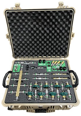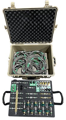 Ruggedised high‑pressure oxygen fill/adapter kit, hoses, manifold and fittings are built to spec, oxygen‑cleaned to MILSPEC‑1330‑D and bagged. The case includes custom foam to maintain component control.