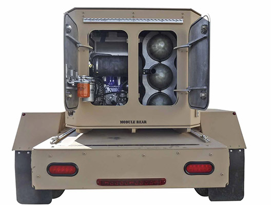 - Prime mover: 25 HP (≈ 18.6 kW) diesel, ~19 L fuel cell, (2) 12 V batteries, DC‑AC inverter.