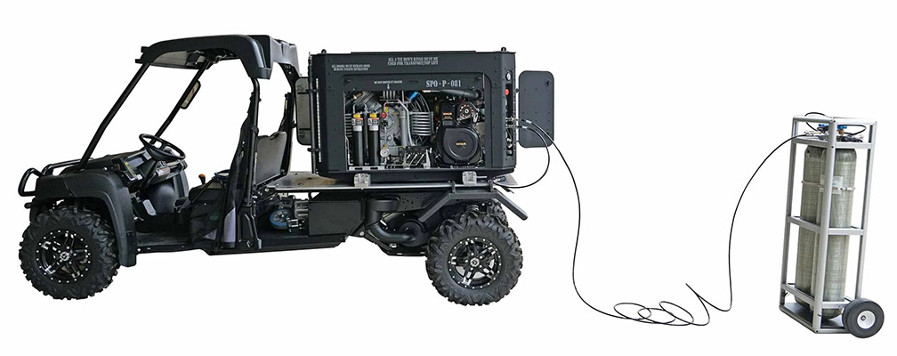 TVASS is a large‑volume, mobile Grade‑E breathing‑air workstation designed to refill SCBA on operations that need substantial on‑hand air. Units can be stacked and manifolded to create a larger bank; QF4 high‑pressure plumbing enables high‑flow fills and direct connection to other TVASS units or AirJam platforms.