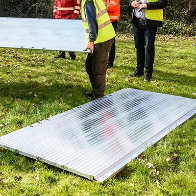 AmP is a heavy‑duty aluminium trackway that crews can deploy without cranes. It is set down by a JCB 926 (or similar) and then manually laid, delivering robust roadways with a small team. Each panel measures 3000 × 1150 × 40 mm and weighs about 104 kg, with axle capacity up to 12.5 tonnes (ground‑dependent static bearing up to 100 t/m²).