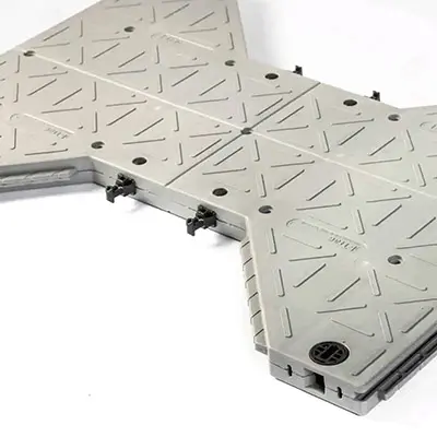 i‑Trac is a composite interlocking panel that creates a continuous, heavy‑duty roadway or pad with a small crew. The brick‑weave formation spreads load and avoids long linear weak points, while an inbuilt connection device (no special tools) speeds installation.