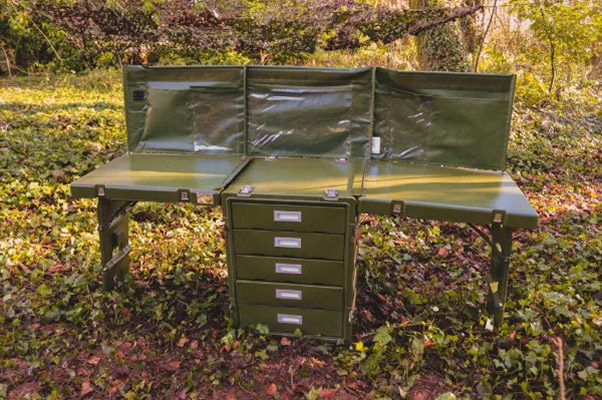 A folding command/administration workstation with drawers and side leaves. Packs compact for transport; unfolds into a stable desk rated to 125 kg total load (or 1.0 kN/m UDL).