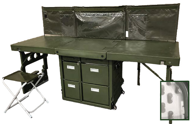 DD² is a simple, highly practical field desk that sets up in under 2 minutes and packs down into one wheeled case for transport. It’s robust yet lightweight, giving you a full‑size work surface, integrated storage and optional privacy/security screens for classified tasks. Move it by one person on its wheels or two people carrying, then stow it just as quickly when the job’s done.