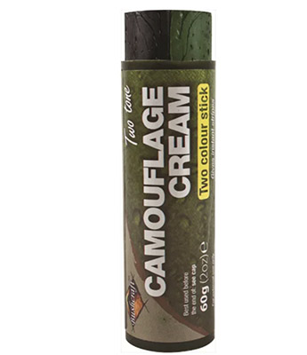 - Black/Green 60 g Camo Cream Stick: Two-tone jungle / woodland camo for forest, bush and heavy vegetation.